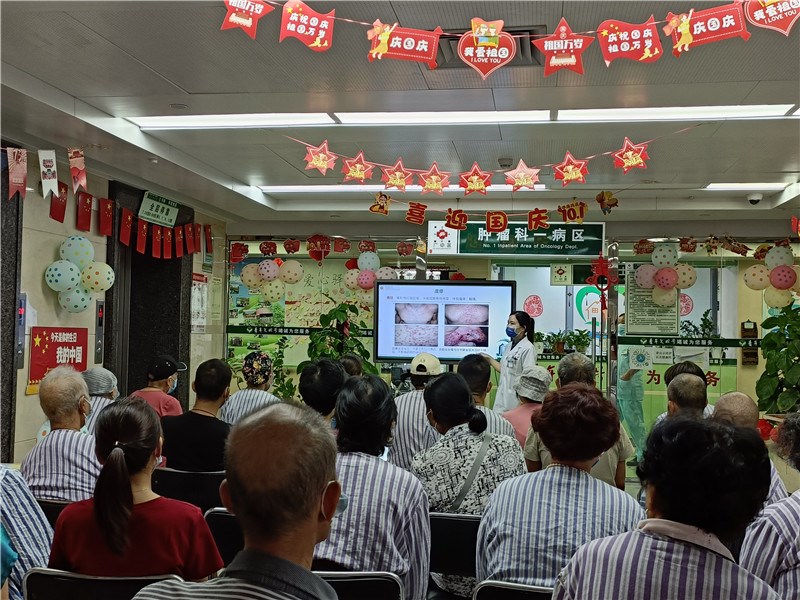 关怀患者,健康普及。本次活动首先进行“靶向治疗药物的不良反应”健康知识讲座,患者认真倾听医护人员的殷殷嘱托。紧接着是患者最喜爱的游园活动环节,本次活动为患者筹备丰富的游戏、手工、智力活动,有欢乐投壶、快乐益智连、玫瑰剪纸、趣味拼图、花开雏菊等。患者们积极参与到各个游园环节中,一张张笑脸绽放在病房,环境热烈暖心,四处是社工、志愿者和医护人员陪伴患者共同欢庆节日的画面。最后所有工作人员手举祝福牌,表达对祖国发展繁荣昌盛的祝福。