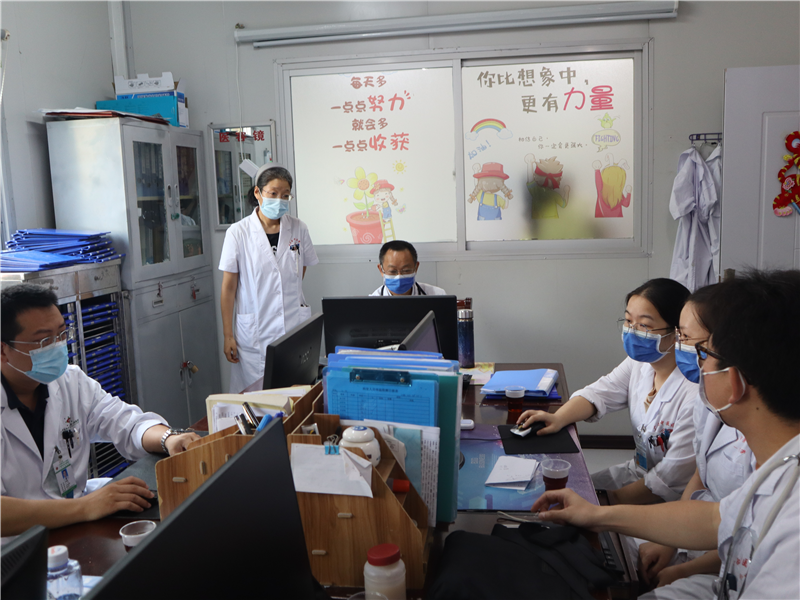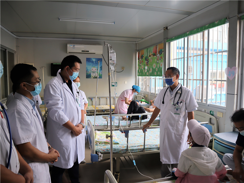 随后,专家团队至儿科病房进行教学查房。李伟伟教授主要查看疑难患儿,其中一患儿双侧腮部肿大22天,反复出现全身皮疹10年,伴皮肤脱屑及干燥,既往有生长发育迟缓病史,四诊合参,辨证属于邪入营阴证,治当滋阴养血,清热透邪,拟柴芍三甲散加减。同时鼓励患儿及家属要有治愈的信心,坚持治疗。通过疑难病例的深入交流、讨论,为当地医护人员提供中医辨证思路,提升中医思维。