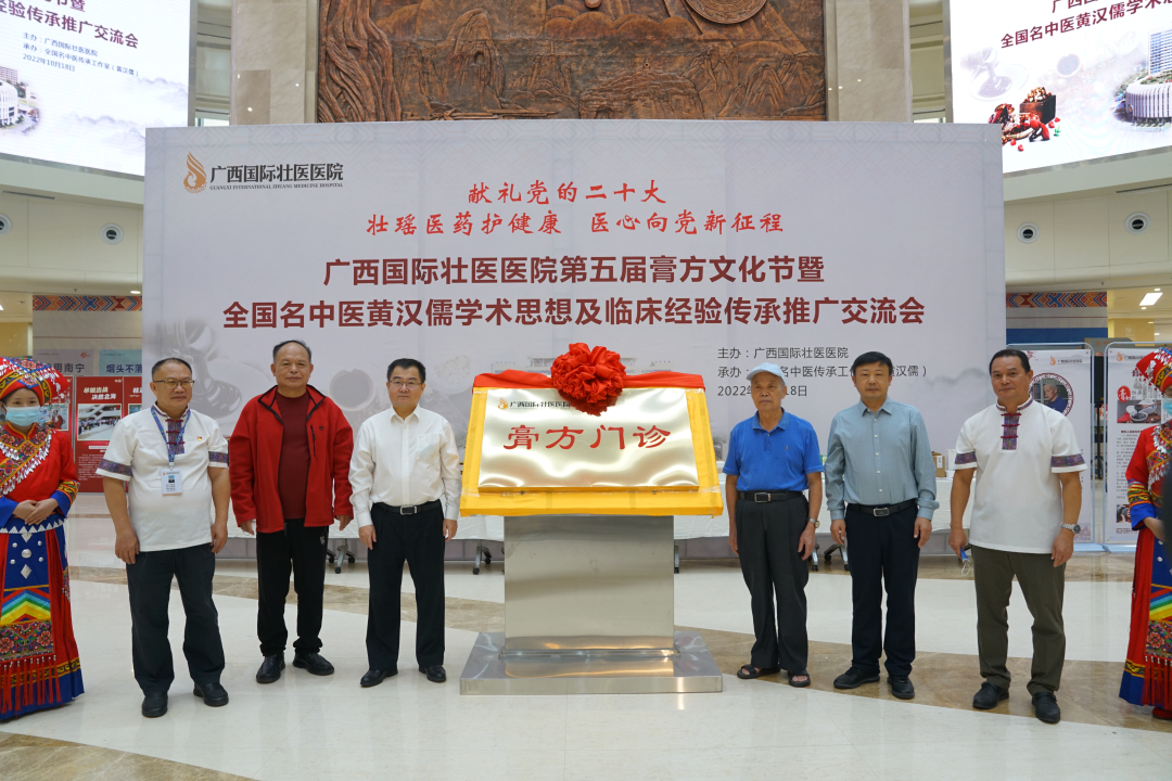 开幕仪式上,全国名中医、广西国际壮医医院壮医学术首席专家黄汉儒,广西产业技术研究院副院长杜文宏,医院党委书记秦祖杰,中国民族医药协会原副会长、中国经济新闻联播网顾问冯岭,医院副院长黄国东、李继清等多位领导共同为“膏方门诊”揭牌。