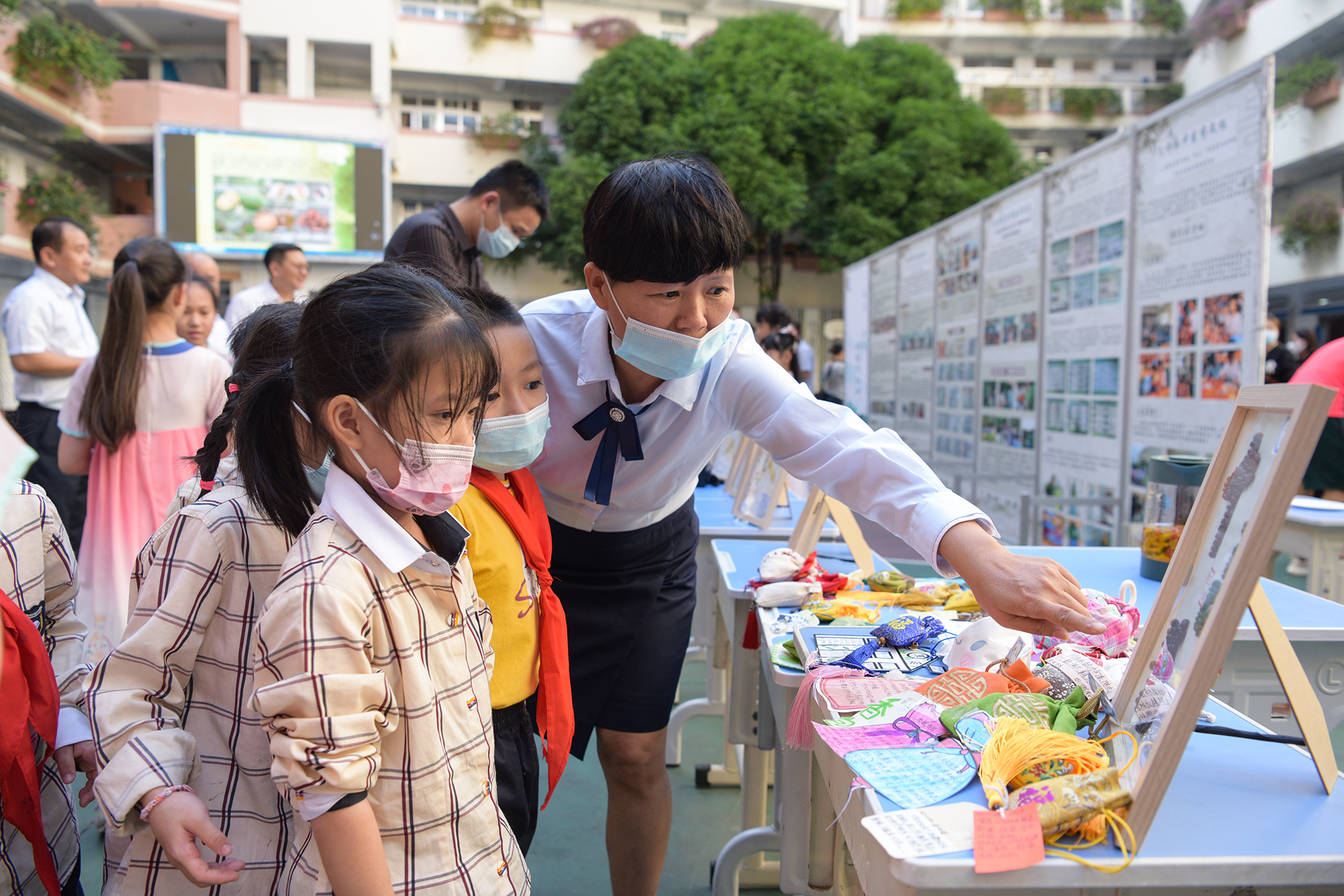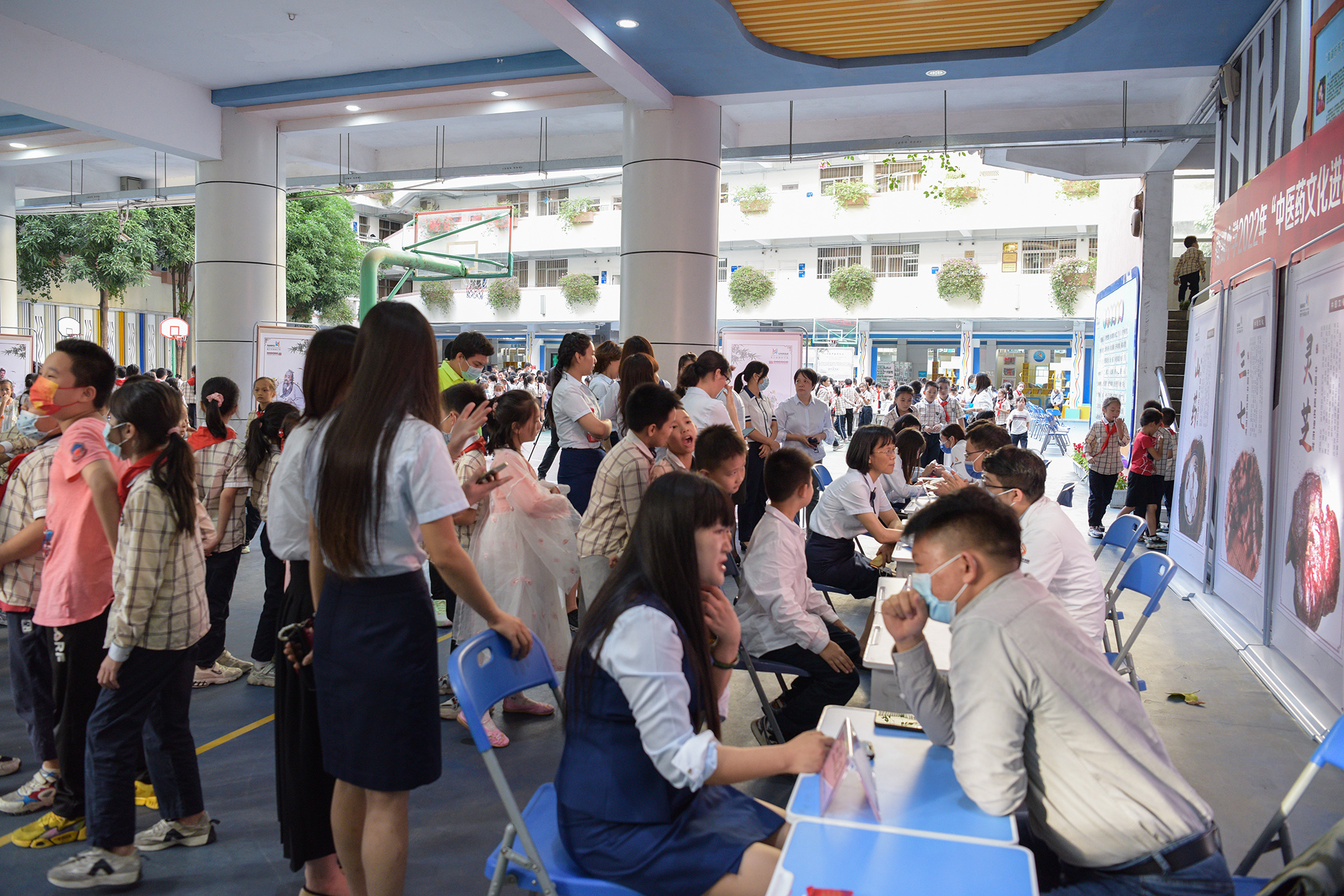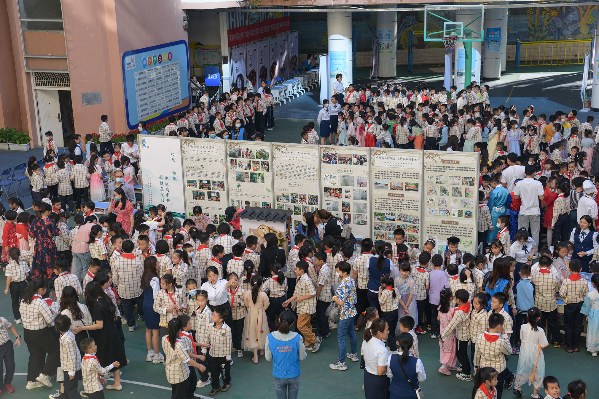 在校园中心操场,设有一到六年级“初爻”中医药文化社团综合性实践活动成果展示区和现场实践操作展示区。各年级以“展板+实操+讲解”的方式,通过图画作品、实物展示、药膳美食等,生动有趣地展示了中医药文化社团的学研成果。