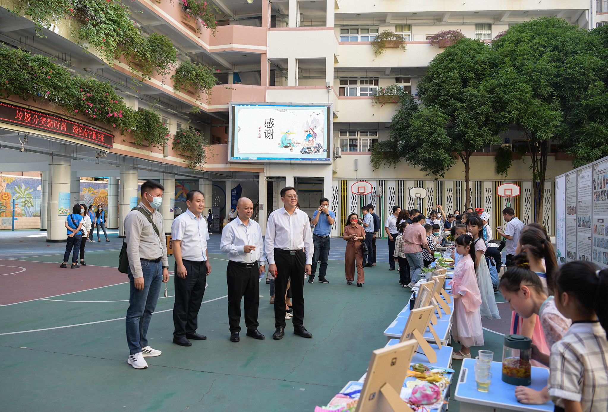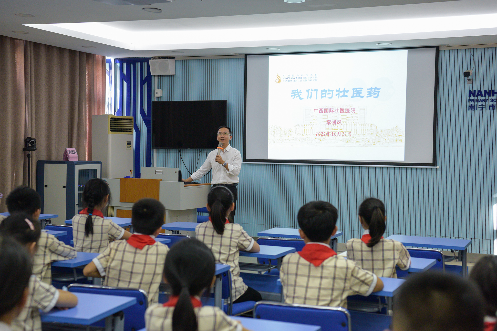 10月31日下午,附属国际壮医医院副院长、总会计师唐盛军率医院中、壮、瑶医专家参加南湖小学“中医药文化进校园”项目——“初爻”社团学期项目式综合性实践活动成果展,并向南湖小学赠送了中医药科普读物、涂色绘本。