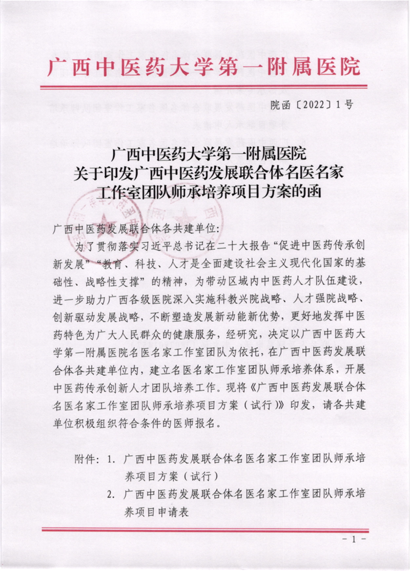为深入学习贯彻党的二十大报告“促进中医药传承创新发展”精神,充分发挥一附院作为广西龙头中医医院的人才优势、理论优势、技术优势、平台优势,开辟八桂中医药人才培养新领域,为广西中医药传承创新事业不断塑造发展新动能新优势。在建院80周年之际,一附院基于广西中医药联合发展体的五年建设经验,以院内名医名家工作室团队为依托,面向全区开展广西中医药发展联合体名医名家工作室团队师承培养项目,在广西中医药发展联合体各共建单位内,建立名医名家工作室团队师承培养体系,开展中医药传承创新人才团队培养工作。