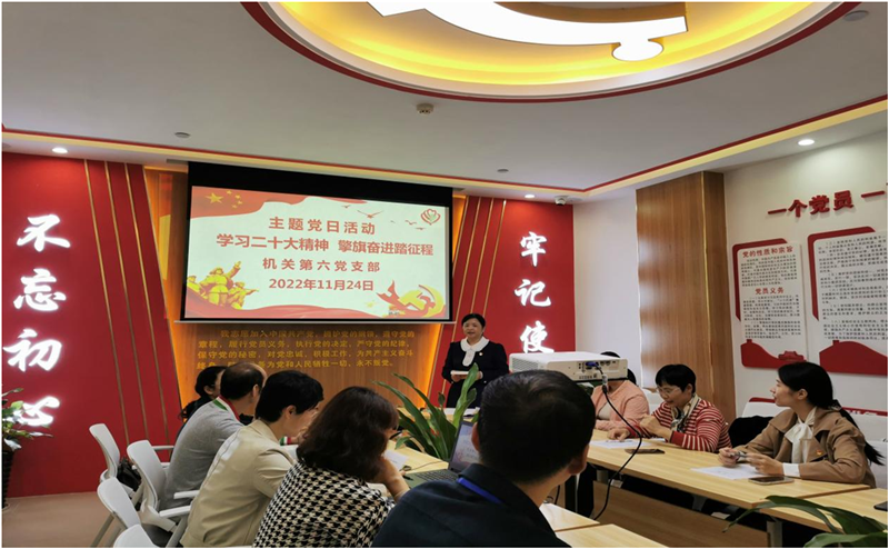 11月24日上午,一附院机关党总支第六党支部在一附院党员活动室开展主题党日活动,以“学习二十大精神,擎旗奋进踏征程”为主题学习二十大精神,支部宣传委员冯英华主持会议,支部党员参加学习。
