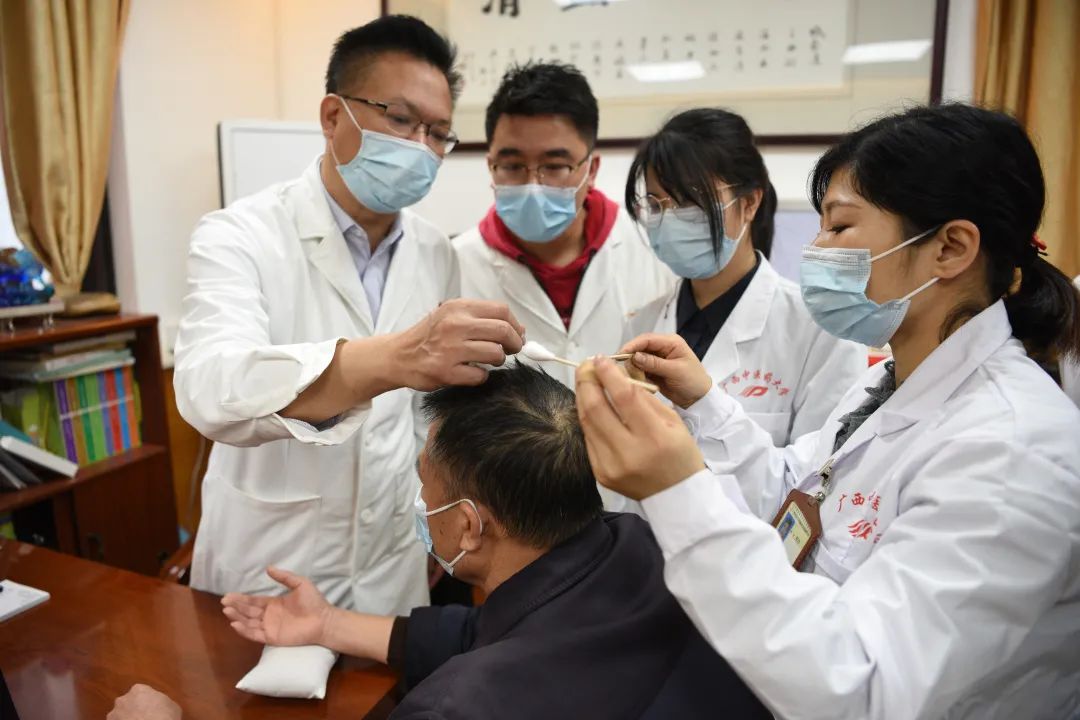 在诊室里,记者见到了李先生,候诊时他脸上愁云满布,一脸茫然。从2013年中风开始,几年来连续发病3次,导致左腿瘫痪,走路无力,曾四处求医,效果均不理想。经诊断,韦英才认为他是中风后遗症,因正虚血瘀所致,遂用火针刺其头顶通巧坞,以醒神开窍,通调气机,再寻其筋结,固灶行针,热敏神经,瞬间一股气直通李先生脚底。李先生站起来后用左脚跺了剁地板,一副惊讶的表情:“有力气了,感觉到有力量了!”从他的眼神里,看到了希望的光。韦英才给他制定了壮医经筋疗法结合中壮药内服的后续治疗方案,让他放宽心,嘱咐他坚持配合治疗,一定能好起来。