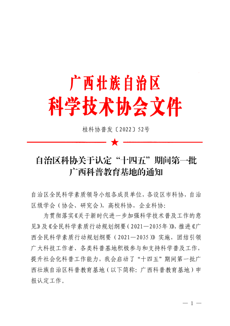 此次科普教育基地认定是自治区科协为贯彻落实《关于新时代进一步加强科学技术普及工作的意见》及《全民科学素质行动规划纲要(2021-2035年)》,推进《广西全民科学素质行动规划纲要(2021-2035)》实施,团结引领广大科技工作者、各类科普基地积极参与和支持科学普及工作,提升社会化科普工作能力而启动,包括一附院在内的47个单位获批成为我区“十四五”期间第一批广西科普教育基地,有效期为五年(即2023—2027年)。