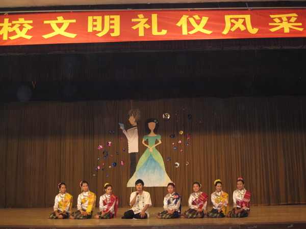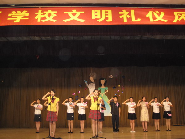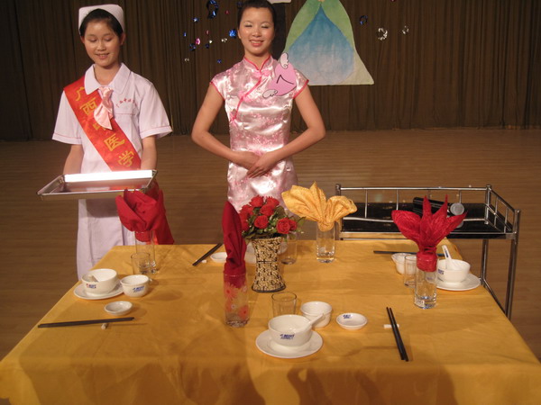 2011年4月19日晚,广西中医学院附设中医学校2011年中华文明礼仪大赛决赛在北湖校区礼堂隆重举行。出席决赛现场的学校领导有吴彬校长、岑家铭书记、罗艺徽副书记及学校各科室负责人、团委学生科的老师。同时,我们荣幸邀请到泰国孔敬大学护理学院实习交换生参加本次活动。担任本次决赛的评委有岑爱音老师、赵英老师、梁国隆老师、李和珍老师和教官队黄田田教官。