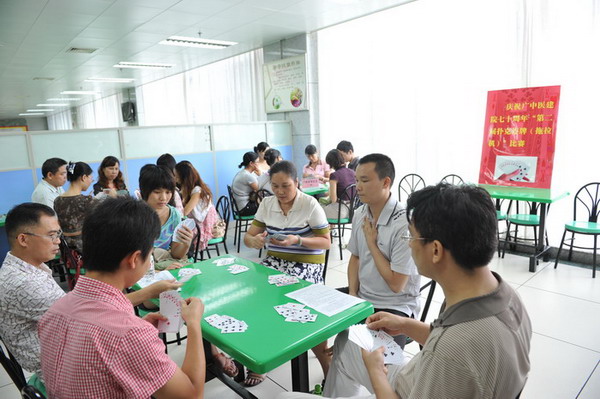 为喜迎2011年国庆节和广中医建院70周年的到来,增进同事交流和友谊,展示广中医人风采,一附院工会今年组织多项比赛。在书画摄影展结束之后,广西中医学院第一附属医院第二届职工扑克连牌(拖拉机)比赛于2011年9月14日在医院营养食堂正式开赛,经过三个阶段单淘汰赛共18场的激烈角逐,于9月15日晚落下帷幕。