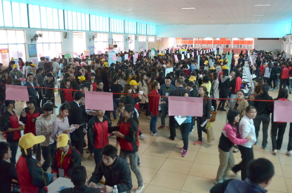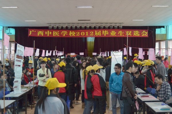 2012年3月23日,广西中医学院附设中医学校彩旗飘扬、人山人海。一年一度的毕业生与用人单位“双选会”在学校大礼堂隆重举行。绵绵细雨仿佛滋润了同学们对美好未来向往的心田,校园内外人山人海。