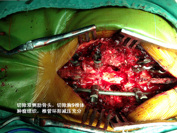 切除双侧肋骨头,切除胸9椎体肿瘤组织,椎管环形减压充分