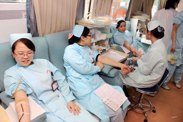 瑞康医院心胸外几名护士正在献血车上为春发互助献血
