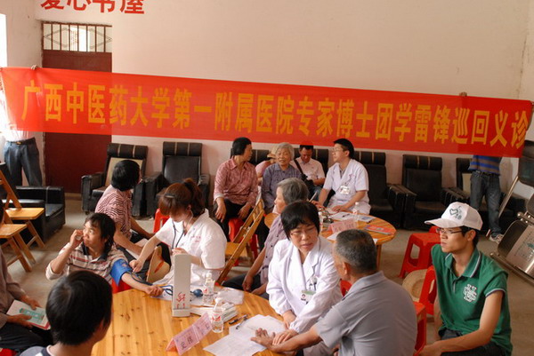 2013年4月20日,由一附院院长助理、大内科主任、肾病风湿病科主任史伟教授带队,一附院专家和博士一行18人到达上林县开展义诊活动,并首次在义诊活动中为基层医务人员举行专科专病学术讲座,受到当地群众和同行的欢迎和好评。这是一附院连续第二年来到上林县开展义诊活动,是“广中医专家博士团走基层”系列活动的第二站,同时也是区直机关团工委组织的“学雷锋﹒关爱留守儿童”志愿服务活动的一个组成部分。上林县县委常委、副县长吴小斌和上林县中医院院长卢坚等当地政府和医疗单位领导出席了活动。