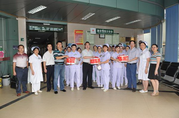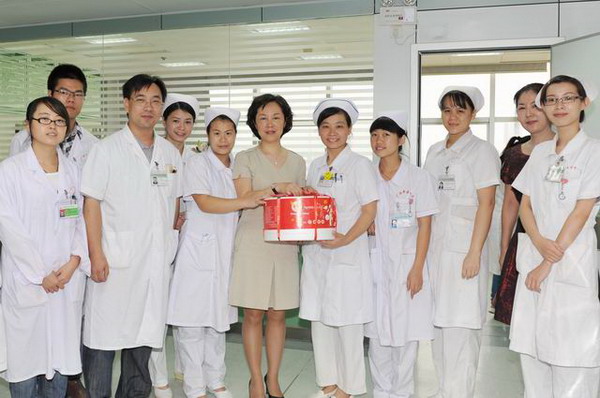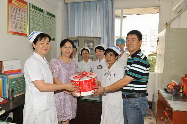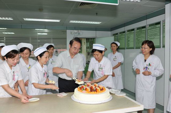 五月的大地夏韵流淌,五月的阳光温暖和煦,一年一度的“5·12”国际护士节如期而至。5月10日上午,一附院院长黄贵华,党委书记李敏智,党委副书记、纪委书记、副院长吴西西,副院长卢健棋、周建国带领各职能科室主任一行十余人前往各科室,慰问正在临床一线辛勤工作着的护士,为大家送上节日蛋糕,送上节日的问候和祝福。院领导亲自切开蛋糕,与护士们一同分享节日的快乐。院领导高度评价了全院护士在践行“悲悯为怀、精益求精”的院训及优质护理服务工作中做出的积极贡献,勉励大家继承和发扬南丁格尔救死扶伤、关爱生命、无私奉献的精神,结合一附院实际情况,突出医院中医护理特色,用真诚和爱心,用热情和关怀,为患者提供贴心服务。院领导的慰问让全院护理人员倍感温暖,大家纷纷表示决不辜负领导的重托,会加倍努力,更好地履行服务患者、奉献社会的职责,推动优质护理服务工作进一步纵深发展,为患者提供全程、优质的护理服务,达到患者满意、社会满意、政府满意、护士满意、医生满意、医院满意的目标。