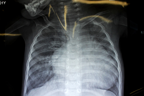 “别以为她的人小,心脏就跟着小,因为患了严重的心脏病,小鑫怡心脏却大得像个大大的皮球!”在心胸外科医生办公室,杨柳山副主任医师向笔者展示了小鑫怡的X光胸片,只见小小的胸腔里,一团白色心脏阴影几乎占满了半个胸部的视野,那是小鑫怡的心脏,就是这颗发育异常的心脏,让小鑫怡降临到这世上的10个多月里,吃尽了苦头。