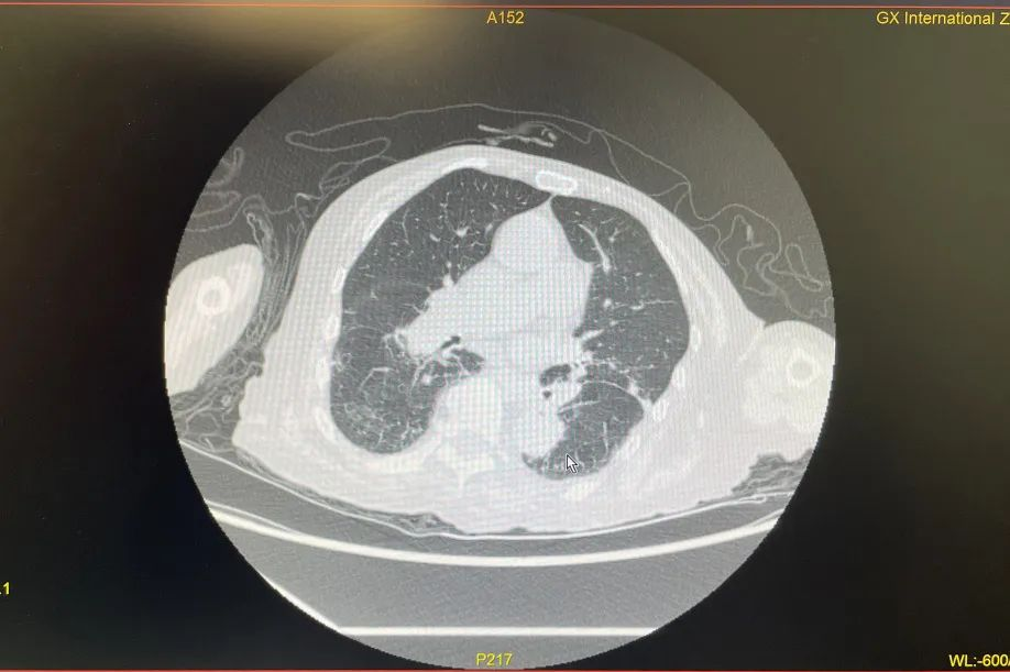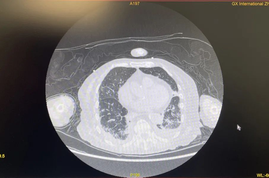 2022年12月末,87岁的胡奶奶因“气喘、咳嗽”等症状到国壮肾病科就医,被发现血氧低下和新型冠状病毒感染,经CT进一步检查发现其肺部感染严重。