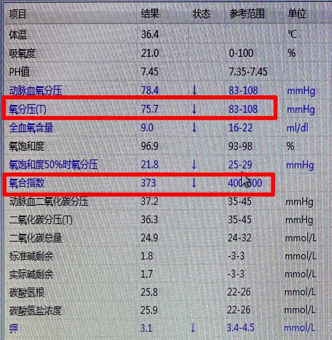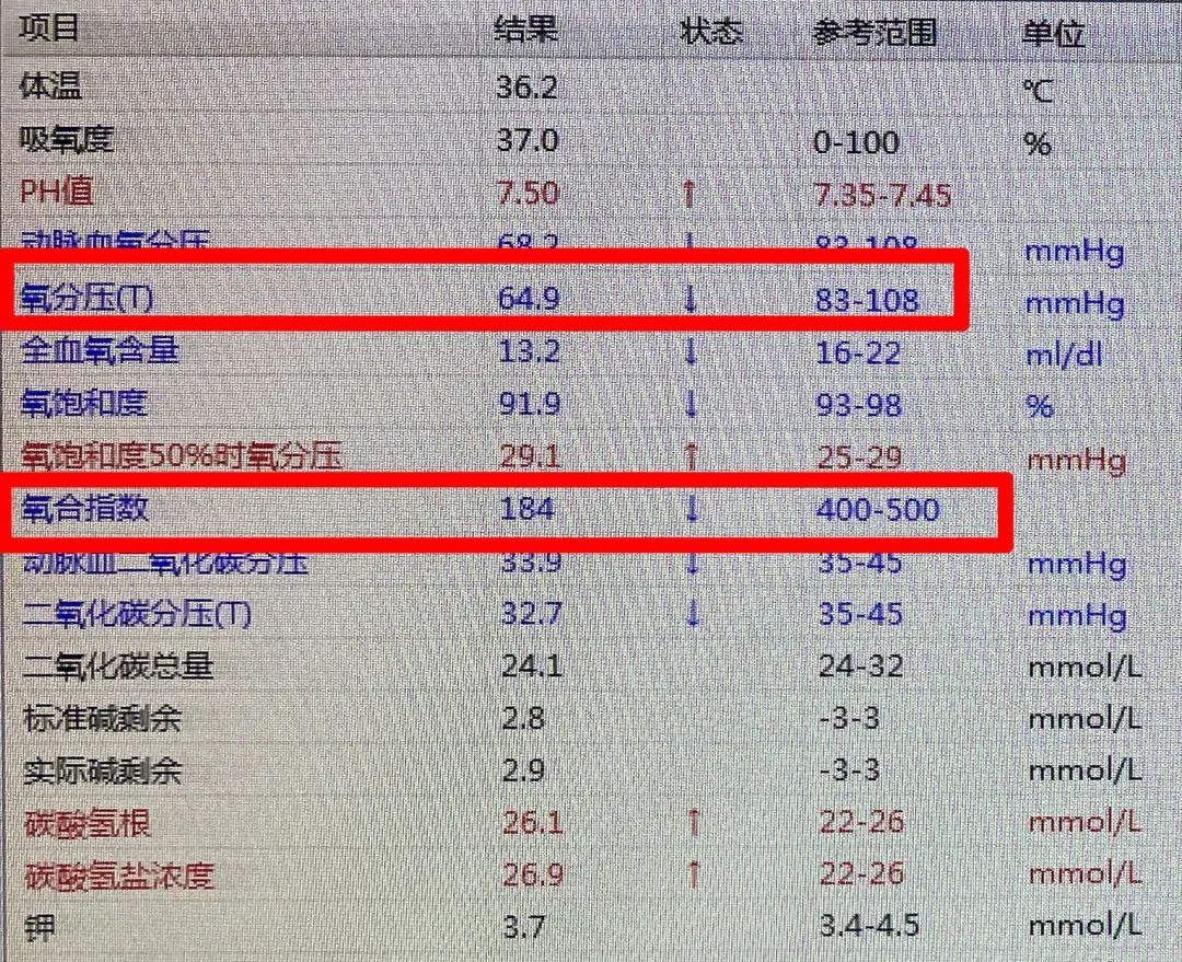 胡奶奶肺炎程度高,氧合指数、氧分压极低。