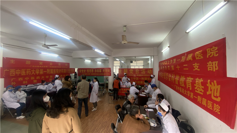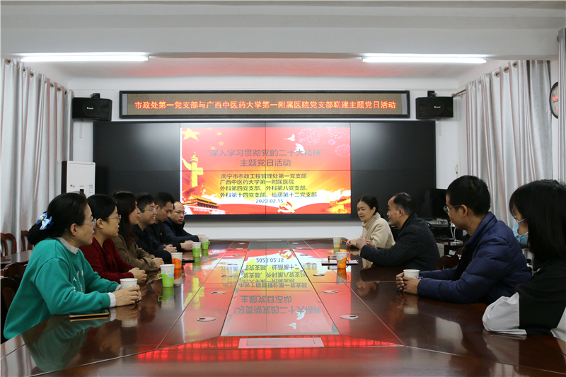 为了“学习贯彻党的二十大精神”,深入开展“我为群众办实事”实践活动,营造风清气正的良好社会风尚,2月15日上午,一附院外科第四、第八、第十四及仙葫第十二党支部到南宁市市政工程管理处第一支部开展支部共建及义诊健康宣讲主题党日活动,活动旨在深入学习贯彻党的二十大精神,更好地服务于群众。