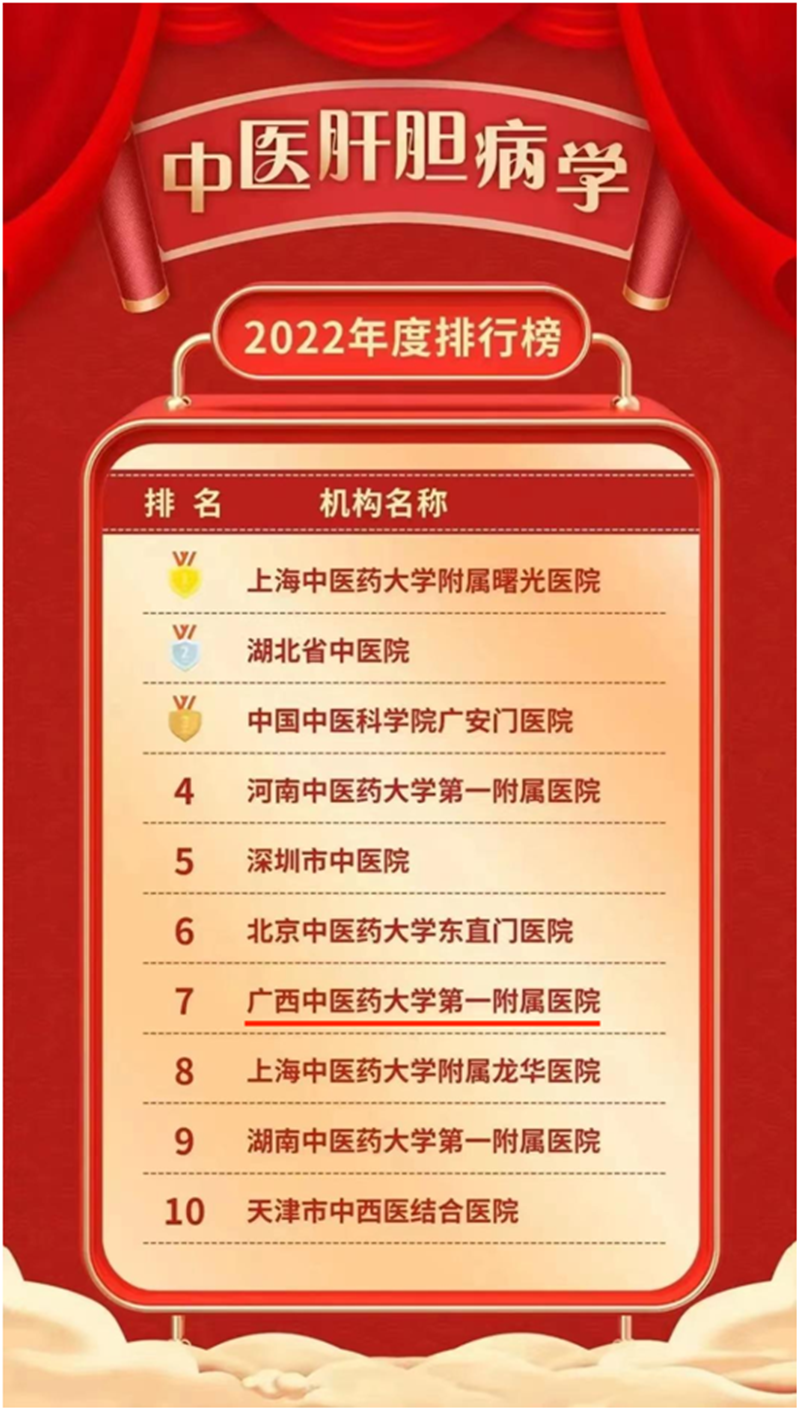 2023年2月19日,中华中医药学会联合中国中医科学院在北京召开《2022年度中医医院学科(专科)学术影响力评价研究报告》发布会暨学科(专科)建设经验交流会,并公布学科(专科)学术影响力榜单,一附院肝病科进入全国中医医院学科(专科)学术影响力前十位,位列“中医肝胆病学2022年度排行榜”第七位。