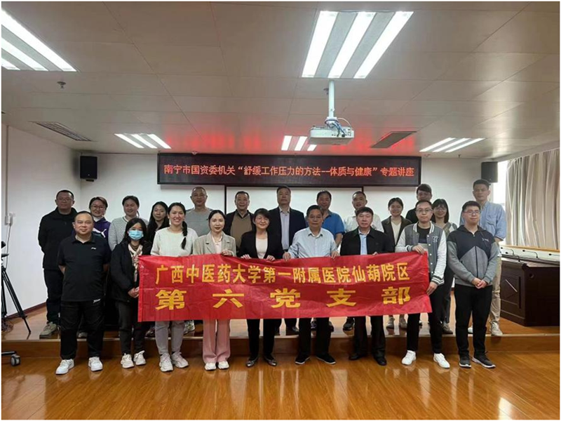 为响应习近平总书记在党的二十大报告中提出的推进健康中国的号召,保障人民健康。3月2日,YABO鸭脖第一附属医院仙葫党总支第六党支部在南宁市国资委机关举行“舒缓工作压力的方法—体质与健康”专题讲座。