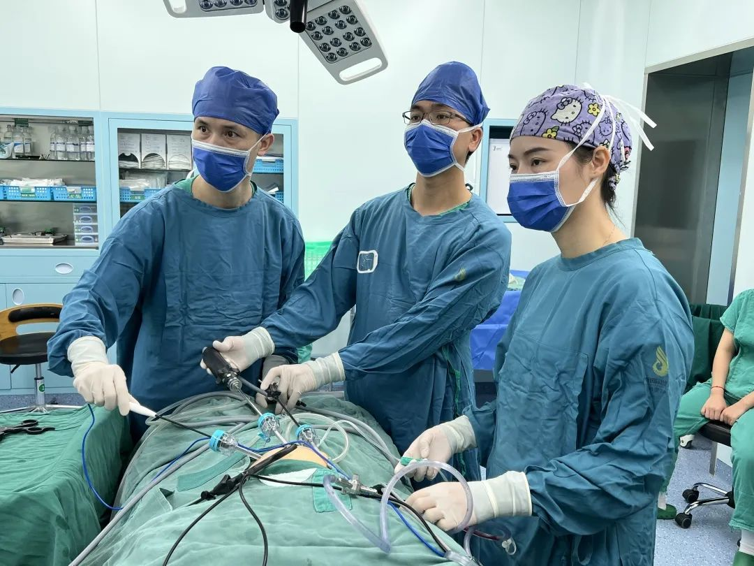 副主任医师秦伟(左一)主刀为患儿行腹腔镜下大网膜囊肿切除术