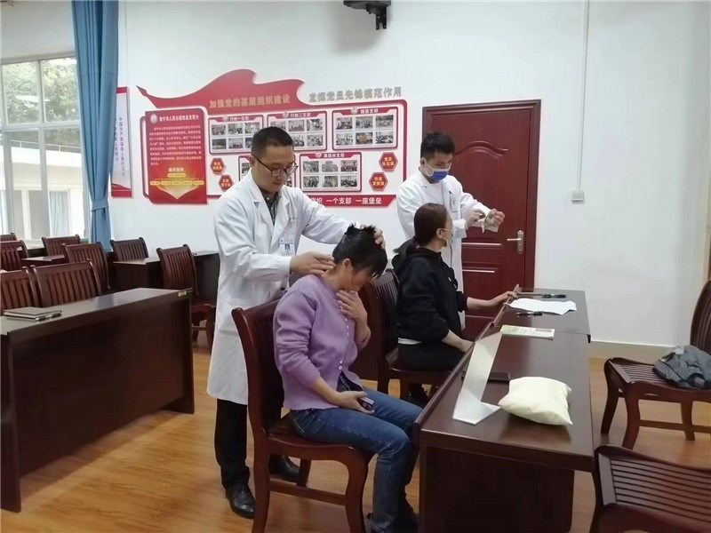 随后,两位医生还为现场的职工开展了健康义诊,主要有中医把脉问诊、壮医线疗点穴、中医按摩等项目。问诊职工有序排队等候,医生对职工咨询的问题一一给予详细解答,针对病情开具对应处方。“真是太舒服了,中医推拿真的好神奇!给我们的医生100个赞!”一位满脸挂着笑容的女职工开心地说道,她在检查过颈椎后,义诊专家使用中医手法给她按摩。