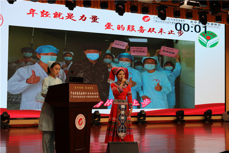 “阿牛哥,广西青年文明号来嘹!”伴随着一句嘹亮的歌声,身着壮族服饰的95号副号长黄静出场。极具民族特色的出场方式让在场的评委及观众眼前一亮。随后,汇报人黄静以“年轻就是力量”为主题,紧紧围绕科室青年文明号服务特色及创建成效,通过“二年轻””五力量”两大方面进行汇报。一张张精彩的医患图片、一个个动人的奋斗故事,黄静时而娓娓道来,时而慷慨激昂,充分展现了青春奋斗、无私奉献的风采,获得了在场评委及观众的一致好评。