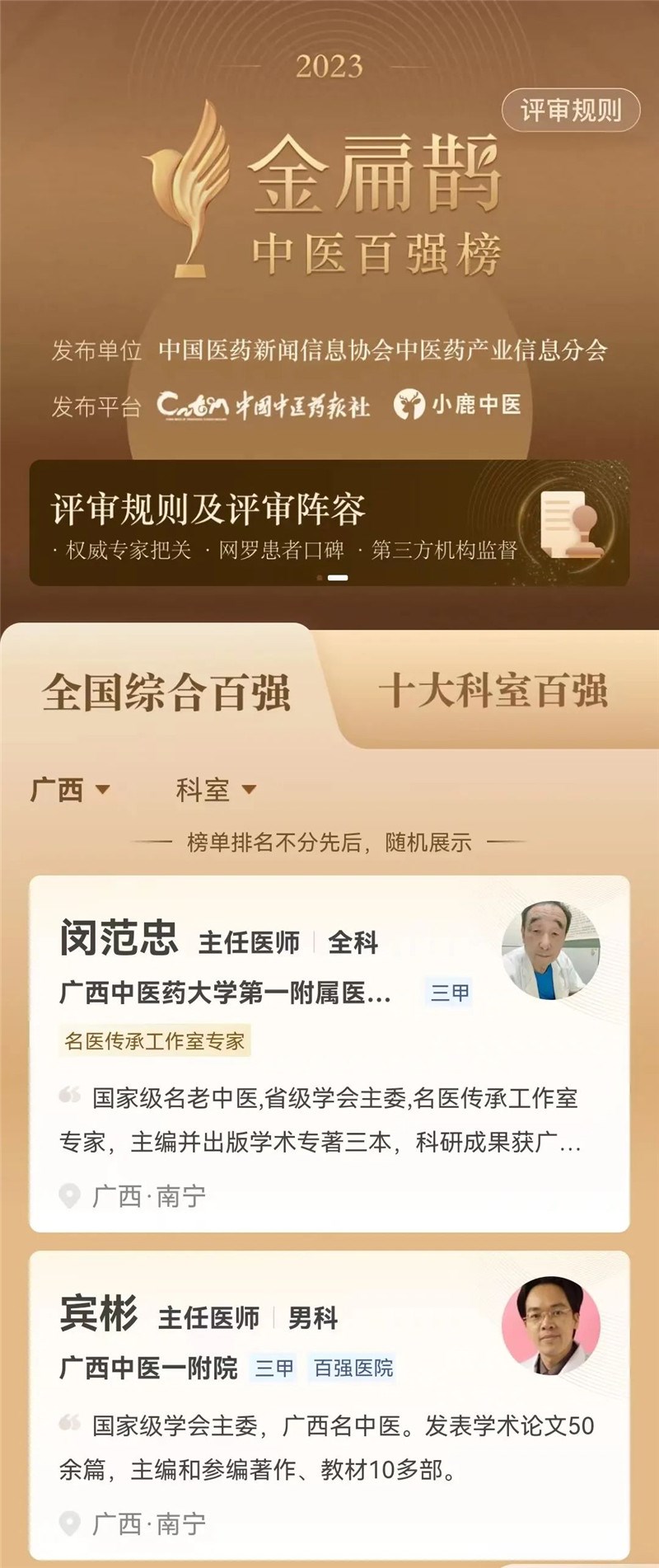 本次评选共有622位来自全国各地的口碑好中医上榜。其中包括一附院宾彬教授、闵范忠教授在内,广西有4名中医专家入选。