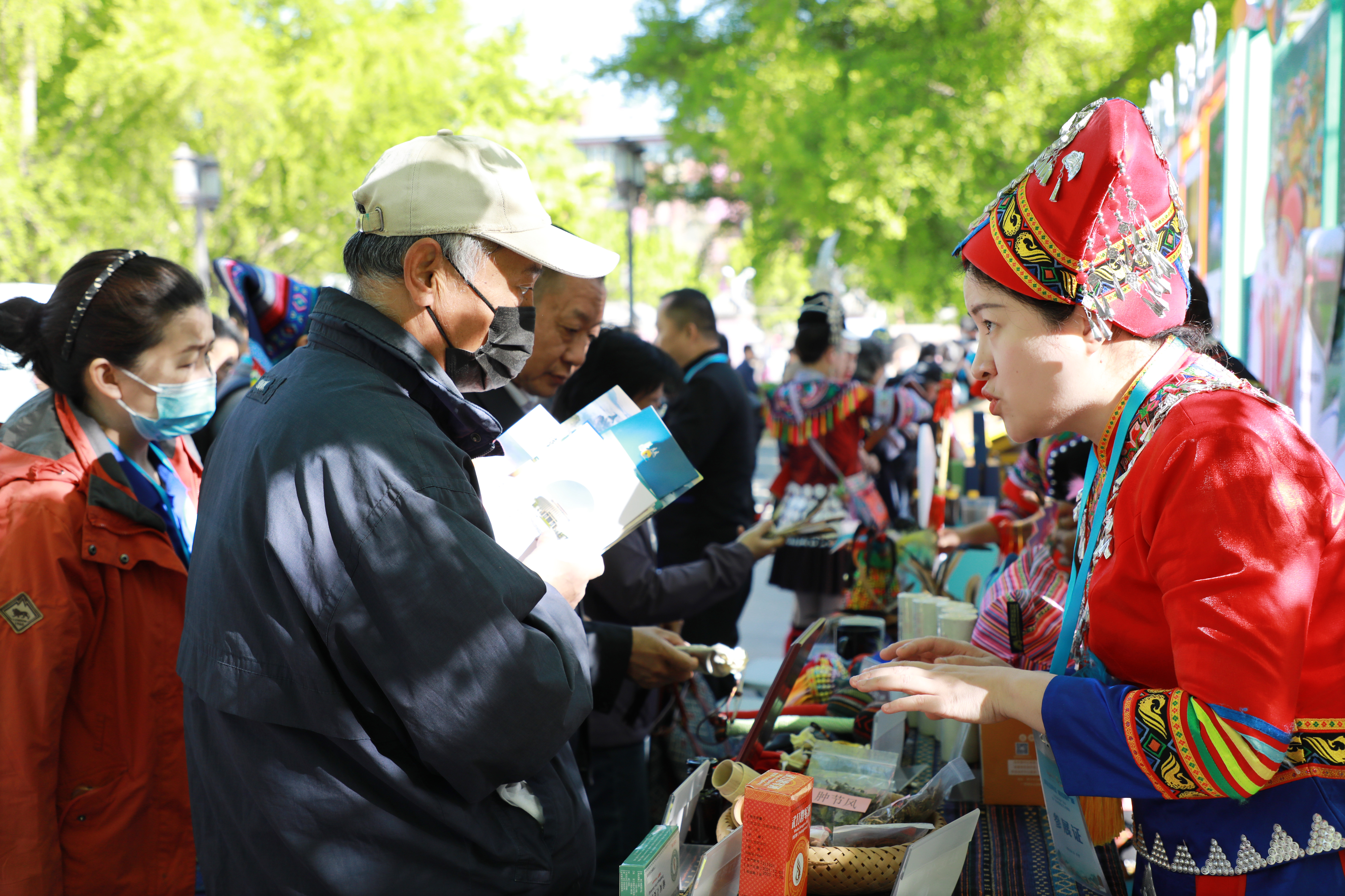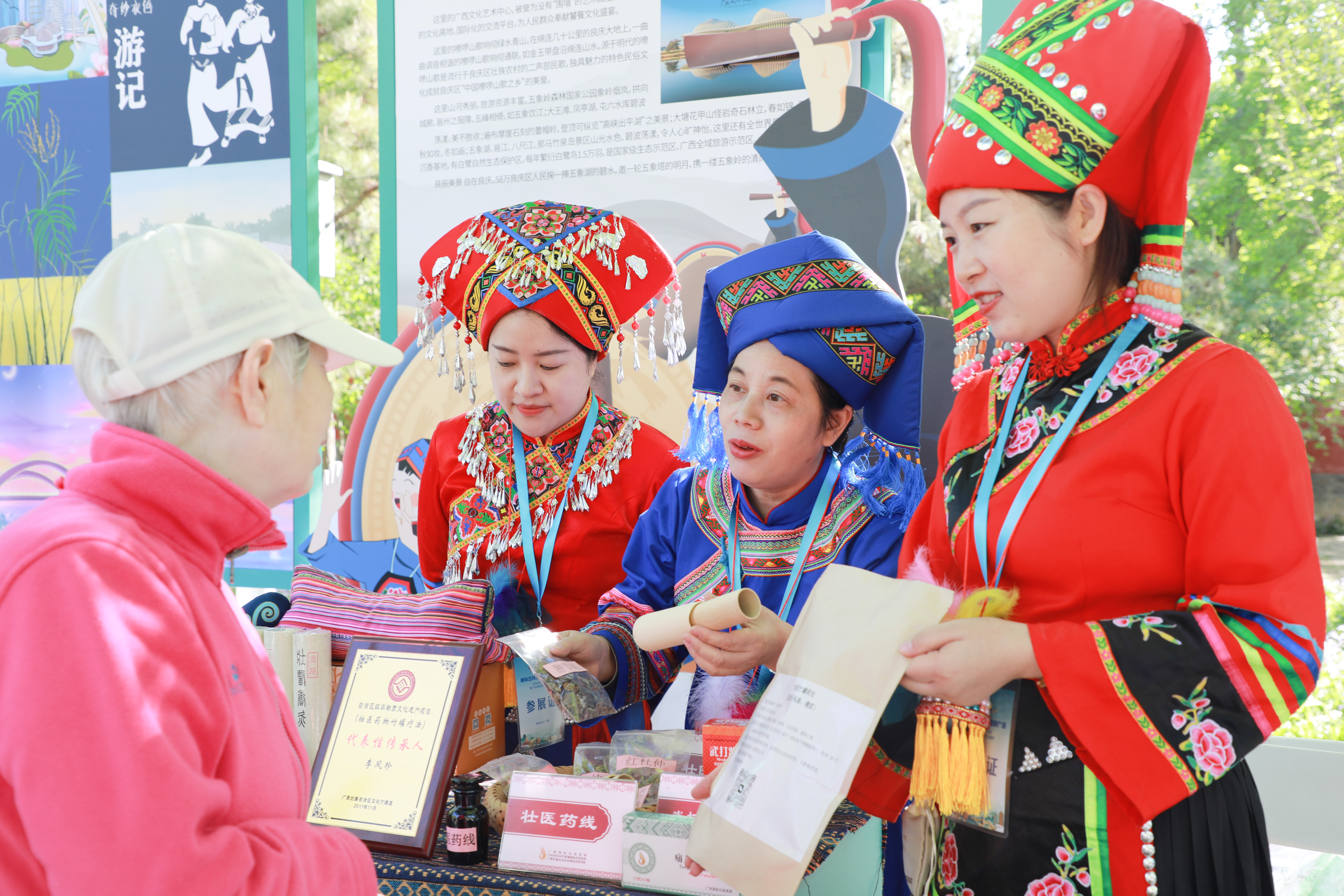 不仅壮医壮药受到热捧,医护人员的暖心服务、精致典雅的壮族服饰也广受喜爱。家住地坛公园旁的市民郭先生是一名书法爱好者,他在参观国壮展位后,立马回家拿取个人书法作品前来送给医护人员,并对其服务赞不绝口。“你们的衣服好漂亮啊,可以合个影吗?”还有不少市民朋友趁医护人员工作间隙前来合影,并表示有机会一定要来广西游玩,要来国壮走走看看、体验一番。