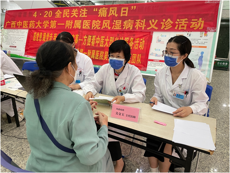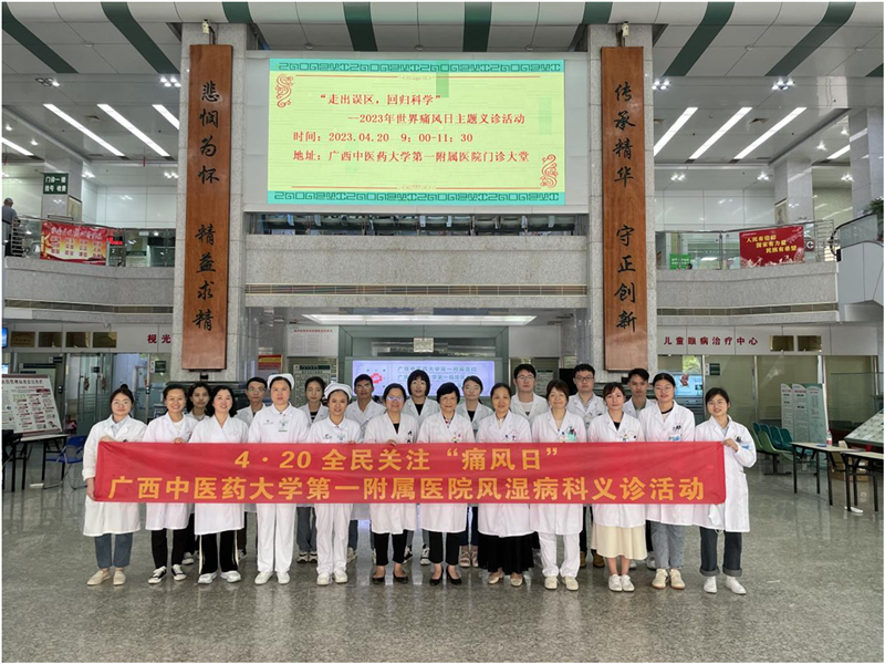 今年是第七个全民关注痛风日,为了向公众普及高尿酸血症/痛风的相关知识,提高公众对高尿酸血症/痛风的防范意识、推动科学治疗痛风的方法。推进高尿酸血症/痛风的中医、中西医结合规范化管理, 4月20日,一附院风湿病科在我院东葛院区门诊大堂举办“回归科学,走出误区”的主题义诊活动,受到广大公众及患者的积极关注及响应,吸引了两百多名患者及家属积极参加本次活动。