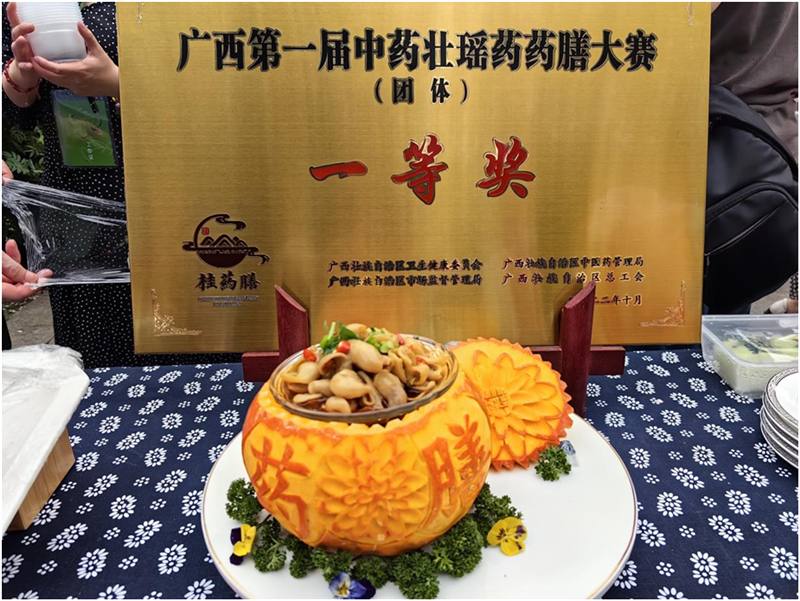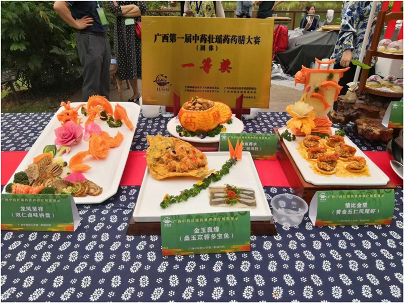 本次药膳展示汇集中药壮瑶药药膳特色,在壮族三月三节日的背景下,以喜庆的婚宴为主题。各参展单位各司其职,各尽其责,呈现出30余道以传统食材结合药食同源的中药材制作出的融色、香、味、形、效为一体药膳作品。一附院作为区内中医医院龙头具有浓厚中医药膳传统文化氛围,在药膳食疗领域注重理论研究与实践应用相结合。本次营养科充分利用广西道地药材中的食药物质,设计制作了六道药膳美食:第一道:“龙凤程祥”,以广西道地药材中的食药物质八角、肉桂、砂仁、益智仁、罗汉果、橘皮、小茴香卤制牛肉等食材,具有温中散寒、助阳行气之功用; 第二道:“金玉良缘”,以鲜玉竹、桑椹、肉苁蓉配上多宝鱼,色彩艳丽、味美可口,还能补肾益精、滋阴养血......