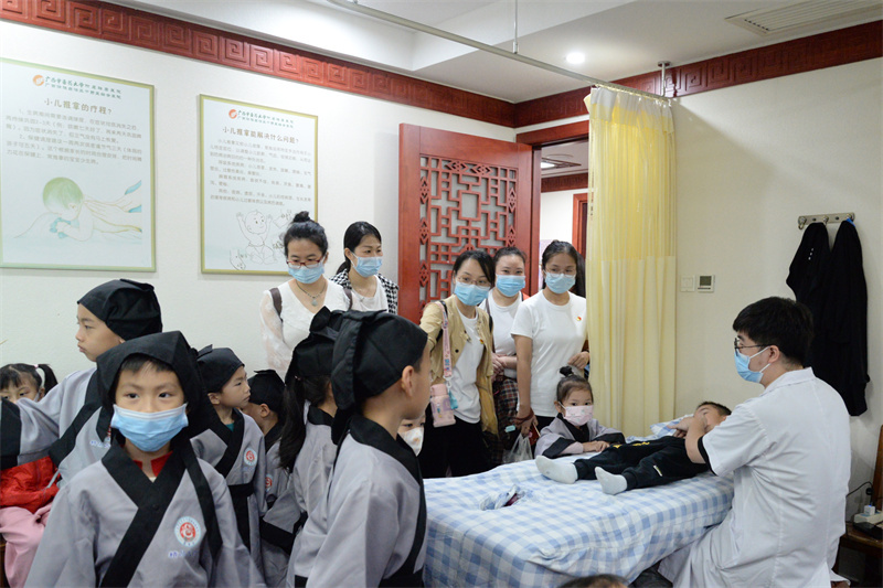 参加此次活动的小学生化身“小郎中”,参观了国医大师馆、院史馆、治未病中心、正骨推拿理疗馆和中医药博物馆,体验中医药文化,感受中医药的文化和特殊魅力。每个科室的讲解员为“小郎中”们介绍了生活中常见的一些中医药知识,让孩子们走进诊疗室近距离观看脐灸、小儿推拿、牵引、艾灸等特色中医疗法。在中医药博物馆里,“小郎中”们不但聆听了梅花鹿皮毛标本、名医塑像、几百种的中药材标本与饮片的详细介绍,还参加多项馆内体验活动,包括品尝养生药茶、学习辨别中药五味、练习八段锦健身功法以及配制适宜的中药香囊等,激发了小朋友们对中药的浓厚兴趣。