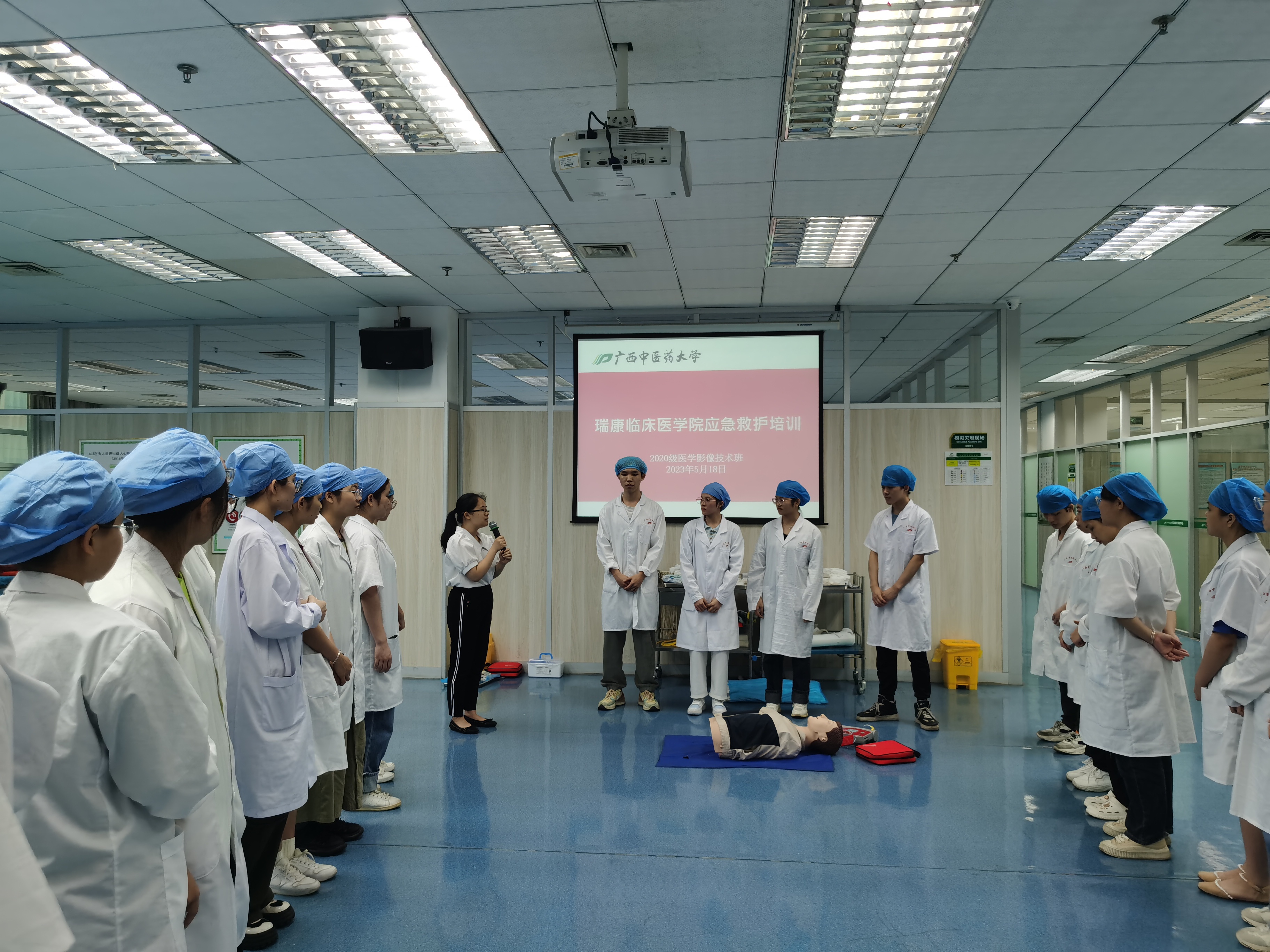 为扎实开展学习贯彻习近平新时代中国特色社会主义思想主题教育,号召广大党员干部职工立足岗位作贡献,促进医院高质量发展。5月18日下午,瑞康临床医学院2020级医学影像技术一班在图书馆实训中心三楼开展“急救知识——心肺复苏”应急救护实训培训课程。