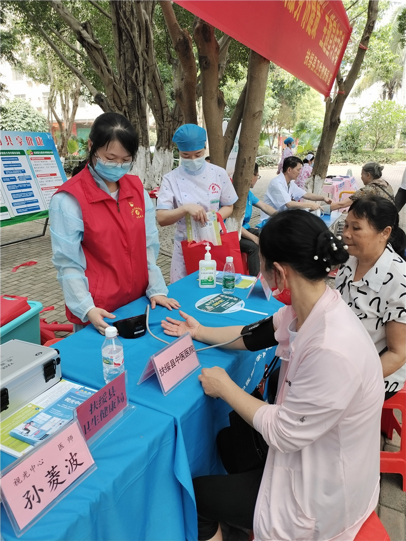 为进一步学习贯彻习近平新时代中国特色社会主义思想和党的二十大精神,加强对家庭医生签约服务工作的宣传,提高居民签约服务的知晓率和积极性,落实扶绥卫健局《关于推进家庭医生签约服务高质量发展的指导意见》《扶绥县卫生健康局关于开展2023年“世界医生日”主题活动的通知》工作要求,5月19日,附属瑞康医院空港院区医务门急诊健康管理党支部到扶绥丽园广场,开展主题为“学习党的二十大精神‘签而有约,共享健康’”健康义诊宣传活动。