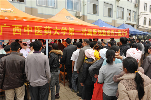 3月19日至20日,由一附院心血管内科、脑病科、脾胃病科、儿科、推拿科、康复科、壮医科、针灸科、皮肤科、心胸血管外科等科室专家组成的名中医博士团分别在东兰县中心文化广场、巴马县民族医院门前,在春寒料峭中为群众进行了大型义诊活动,当地医院的医师非常珍惜这个机会,在义诊中进行了跟师学习。壮医科、脾胃病科以及心血管科的专家分别对东兰县民族中医院和巴马县民族医院的壮医科、内科进行了指导查房和疑难危重病例讨论。义诊活动在当地引起了极大的反响,也说明了群众对中医中药服务充满着期盼,一附院的送医送药送健康活动得到了广大百姓的交口称赞,充分体现了我院对基层医疗机构技术帮扶的影响力和所发挥的作用,也是党的群众路线教育实践活动落到实处的具体体现。