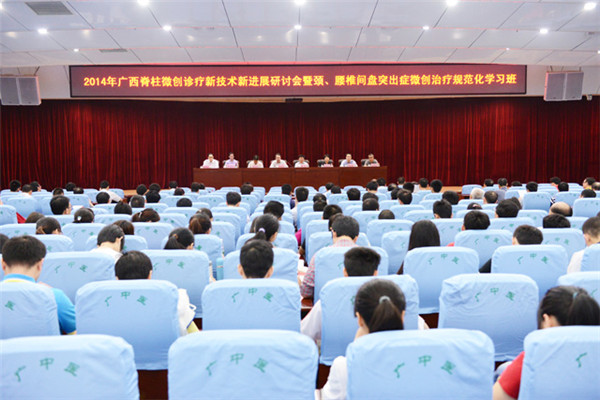 为促进全区脊柱微创诊疗技术的发展,提升全区脊柱微创人员的整体医疗技术水平,经过2个月的精心筹备,广西继续医学教育项目“2014年广西脊柱微创诊疗新技术新进展研讨会暨颈、腰椎间盘突出症微创诊疗规范化学习班会议”于2014年04月19日在一附院门诊楼5楼多功能厅隆重召开。本次会议由YABO鸭脖第一附属医院骨一科主办。广西中西医结合学会秘书长李方教授,一附院院长黄贵华,副院长钟远鸣等领导、专家出席开班仪式,开班仪式由钟远鸣副院长主持,来自全区各地、市、县级各级各类医疗机构200多人参加了学习班。