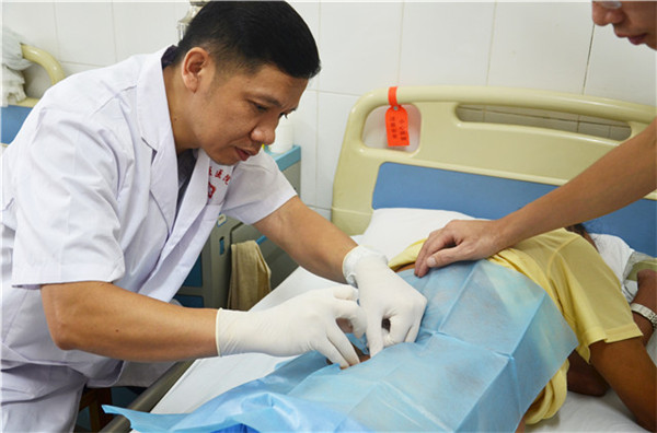 22日上午8点18分,在横县中医医院大门口,举行了简单而不失隆重的技术协作合作医院揭牌仪式。揭牌仪式结束后,一附院推拿科、骨三科、脑病科、针灸科、肝病科、脾胃病科、心胸外科、妇科等科室的专家深入横县中医医院对应科室,为各科室进行专科指导带教查房,对科室重、疑难病症进行了详细的诊断和指导治疗。广西名中医、骨三科主任医师廖小波教授不仅会诊疑难病例,还从骨科常见病的诊疗、常用手术方法的种类、骨折病人术后康复治疗等多方面与科室的医务人员进行座谈。针灸科主任何列涛在指导查房之余,还对一位因臀上皮神经卡压综合症住院的患者实行了小针刀治疗。肝病科副主任王振常教授在查房结束后,还专门抽出时间,为横县中医医院内二科的医务工作者,开展了一堂肝病科常见疾病的小讲课。