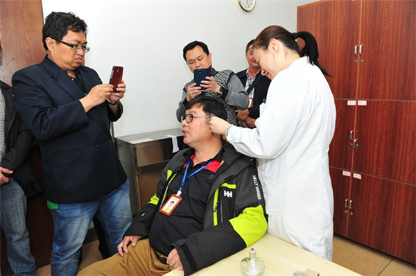 在壮医科,客人饶有兴趣地了解了壮医的独特理论体系、以及一附院壮医品牌“壮医三剑客疗法”,即壮医浅刺、药线点灸、莲花针拔罐逐瘀法,并亲身体验了药线点灸疗法;在针灸科,客人们参观了“黄鼎坚名医工作室”,对一附院自成流派的针灸技法,进行了深入了解和交流;在推拿科,客人认真了解了一附院自成流派的“通法推拿”等,同时观摩了独具特色的妇科推拿、小儿科推拿技法。