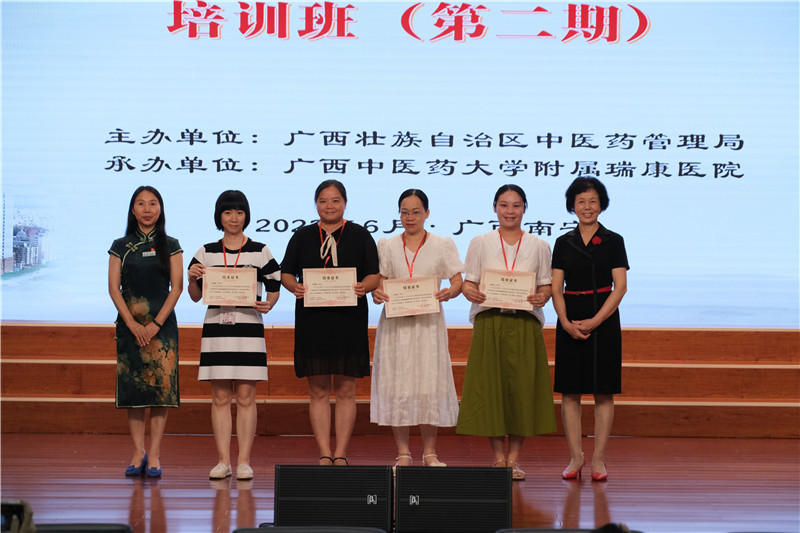 本期培训班评选出三个“优秀中医护理个案”,获奖者分别为附属瑞康医院的中医经典病房的马奇林、桂林市中医医院的伍小玲 、玉林市中西医结合骨科医院的冯小洁。结业典礼上,杨连招和陈日兰为获奖者颁发荣誉证书,并为本期顺利结业的学员颁发结业证书。