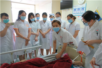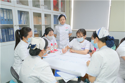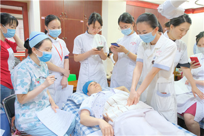 在培训辨证施护能力方面,学员们分组参与了科室的中医护理查房,到床边与科室带教老师一起为患者进行中医体察,针对患者存在的主要护理问题进行中医辨证分析,提出辨证施技、辨证施养等措施,使学员们的中医临床思维得到进一步提升。此外,技能培训内容还包括药线点灸、脐灸、铜砭刮痧、耳穴压豆等4项技术,在实训过程中,学员们在老师的指导下边学边实践,并顺利通过各项技术的考核。