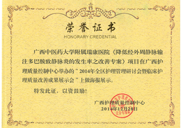 2014年12月27日至28日,由广西临床护理质量控制中心举办的“2014年全区护理管理研讨会暨临床护理质量改善成果展示会”在南宁市凤凰宾馆召开。全区共有58项护理质量成果参与本次展示会,遴选出的16项成果单位在会上作汇报发言,另42项成果以海报形式展示。瑞康医院开展了近三年的护理品管圈活动,在此基础上有两个项目脱颖而出,护理部在大会上做了汇报发言和海报展示——《提高结肠镜检的肠道清洁效果之改善方案》和《降低经外周静脉输注多巴胺致静脉炎的发生率之改善专案》,受到与会专家组和全区护理同行们的一致好评。