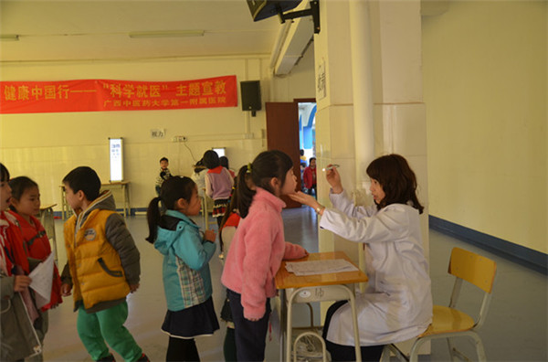 为了对青少年儿童的视力及屈光状态进行早期的干预与预防,由广西少工委与一附院共同主办的“保护视力,从我做起”的眼保健健康宣教活动,于1月15日至16日,在桂雅小学进行。一附院党委副书记、副院长吴西西、共青团广西区委少年部部长、广西少工委副主任杜鹃、眼科赖伟霞、范梓晰、庞运轩等5位医师及2名志愿者,2天时间为该校1、2年级近400名同学进行了眼部的检查及健康知识讲座。活动得到了桂雅小学同学们的热烈欢迎。