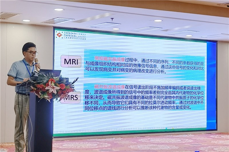 会议专题讲座中,一附院放射科副主任蒙建兴作为广西医学会影像技术学分会副主任委员在大会上做题为《磁共振波普成像在颅脑肿瘤的应用研究》的专题演讲。蒙建兴首先介绍了磁共振波普技术的成像原理,随后进一步分享了我院运用波谱技术在颅脑肿瘤检查中的先进经验。