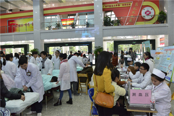 2015年3月7日上午8:30时,义诊活动在住院大楼裙楼大堂内正式开始。一附院推拿科专家黄锦军、雷龙鸣、何育风、苏赐明以及“元之源”伦轼芳、广西壮医医院吴飞、瑞康医院尹宏、区人民医院王程等17名专家及我科其他医护人员参加了本次义诊活动。