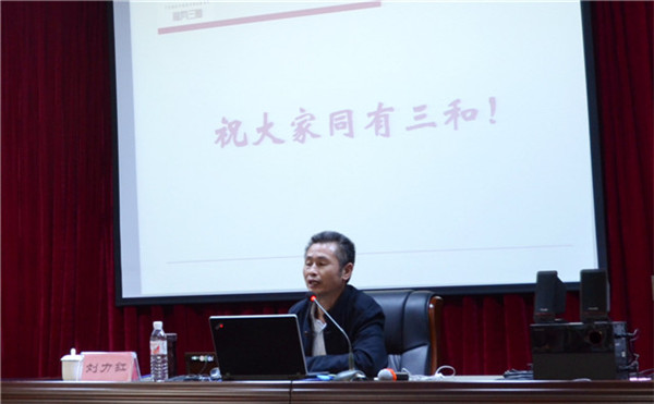 上午九时,我国著名经典中医大家、广西首位中医博士刘力红教授首先登场,主讲《略谈导引按跷》,向大家介绍一种简单有效的自养疗方法。刘教授根据经典理论指导并结合自己近几年的实践成果,主要对腹部导引按跷的养疗方法进行了具体介绍。所谓“阴阳者,天地之道也,万物之纲纪,变化之父母,生杀之本始,神明之府也。”, 刘教授首先强调:无论开方用药,还是导引按跷,都要先别阴阳。刘教授进一步指出:腹乃六腑聚居之地,亦乃五福聚居之地。五脏之藏精气,乃以六腑之传化物(通畅)为前提。腹部按蹻导引要从中央出,由浅入深,由上而下,由右而左,回归中央。刘教授蕴含的深厚中医功底,却在传授的过程中向大家展示了中医的简洁和力量之美。