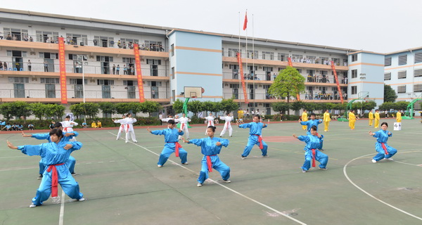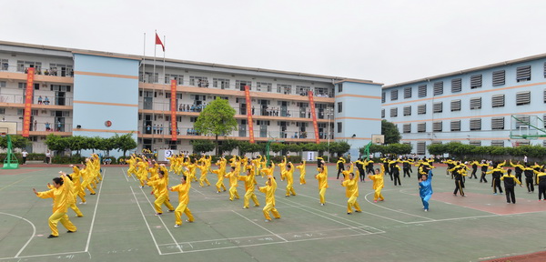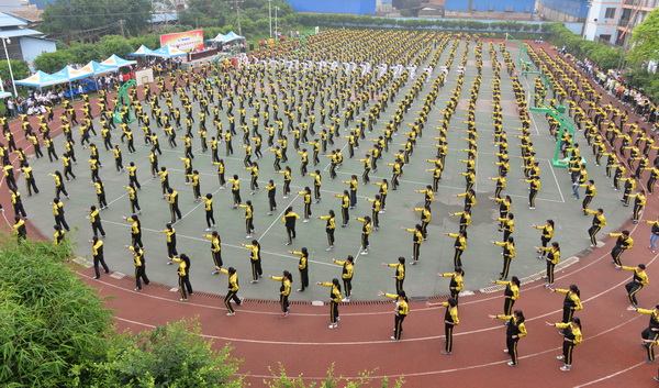接着,在吴彬校长的带领下,学校师生进行千人健身气功——八段锦展演。悠扬的音乐中,千人齐打健身气功——八段锦。他们各个动作灵活连贯,张弛有度、舒展大方。