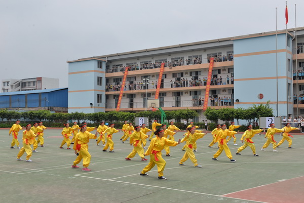 随后,比赛正式拉开序幕。运动会以中华民族传统优秀体育项目:“二十四式太极拳、三路长拳、32式太极剑及健身气功——八段锦”为比赛项目,全校共有27个班级,2420人次参赛。参赛选手们顶着烈日,用他们的热情和熟练的动作,赢得了在场观众的阵阵掌声和欢呼声。经过激烈的角逐,各赛项获奖各有归属。其中,2013级15班荣获健身气功——八段锦、太极拳、三路长拳第一名,2014级2班荣获32式太极剑第一名。