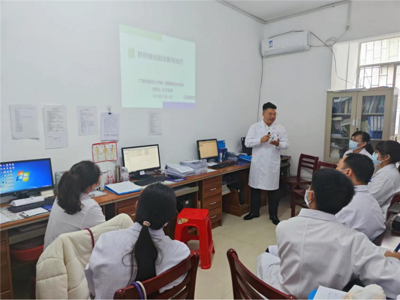 与此同时,龙富立主任医师、官志杰副主任医师到肝病科病区开展教学查房,指导疑难危重病例的中西医协同治疗。查房结束后龙富立主任医师开展题为《肝纤维化的诊断和治疗》的专题讲座,讲座内容接地气,对临床有好的指导作用。两位专家结合一附院肝病科的优势和当地医院的实际情况,对科室学科发展方向、医疗新技术的开展、人才培养等工作提出了具有建设性的指导意见。