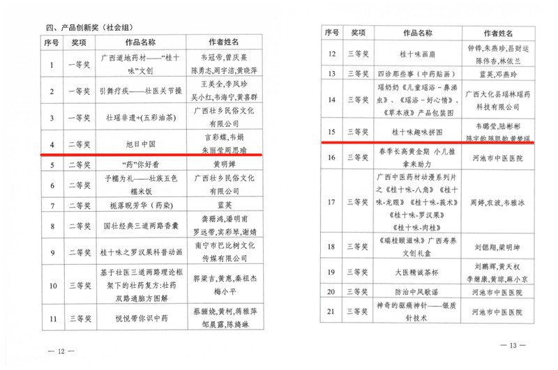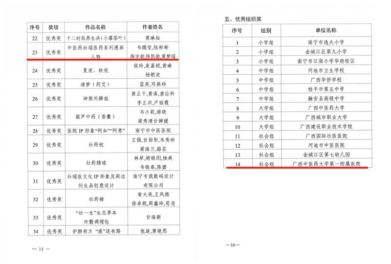大赛共有715件作品参赛,经初评、复评、公示等程序,共评选出获奖作品164个、优秀组织单位14个。其中,一附院参赛作品《旭日中国》中药叶画荣获二等奖,《桂十味趣味拼图》荣获三等奖,《中医药壮瑶医药系列漫画人物》荣获优秀奖,一附院荣获社会组“最佳组织奖”。