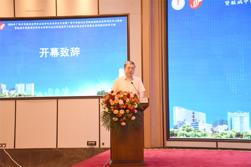 高宏君在开幕式致辞中对各位专家和同仁的到来表示热烈欢迎。他简要介绍了医院的基本情况,医院是广西中西医结合肾脏疾病临床医学研究中心的依托单位,中心是国家慢性肾病临床医学研究中心核心成员单位,致力于提升广西中西医结合防治肾脏疾病的能力,自建设以来取得了一系列喜人的成绩。中心开设五个病区,在中西医结合治疗慢性肾脏性疾病、肾肿瘤、肾移植、肾结石等方面拥有丰富的经验,取得了很好的应用效果。他指出,持续提高肾脏疾病诊疗技术依然任重而道远,本次会议邀请到了许多知名专家分享最新的研究成果,希望大家以此为契机,开拓视野、增进友谊,为推进我区医疗卫生事业高质量发展作出新的贡献。