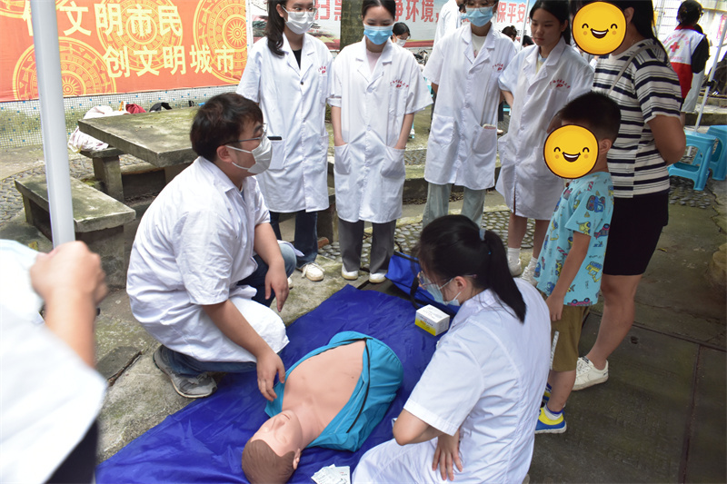 活动伊始,志愿者们有序地布置现场,吸引了许多居民前来咨询。活动中,志愿者们身穿统一红马甲耐心地为居民们测量血压、手法按摩、艾灸等。现场还科普了基本急救知识,一对一地讲解成人心肺复苏和婴儿海姆立克急救法的具体步骤,并邀请居民们进行现场操作。