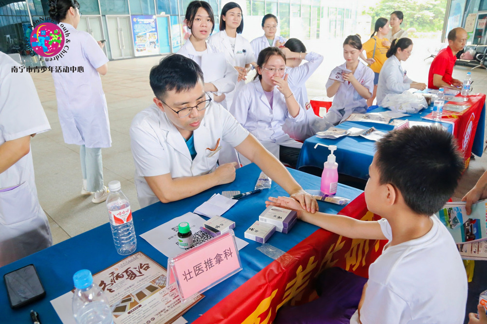 除了知识讲座,党员们还开展爱心义诊,现场演示了壮医特色技法,如壮医药物竹罐、壮医针灸、壮医推拿、壮医贴敷等壮医特色疗法,让青少年亲身体验中壮医的独特魅力。这些壮医特色技法不仅缓解了青少年的身体疲劳,也让他们对中壮医文化有了更深刻的认识。义诊过程中,党员们还提供一对一及小组形式的健康咨询服务,并提供个性化的健康评估和引导。